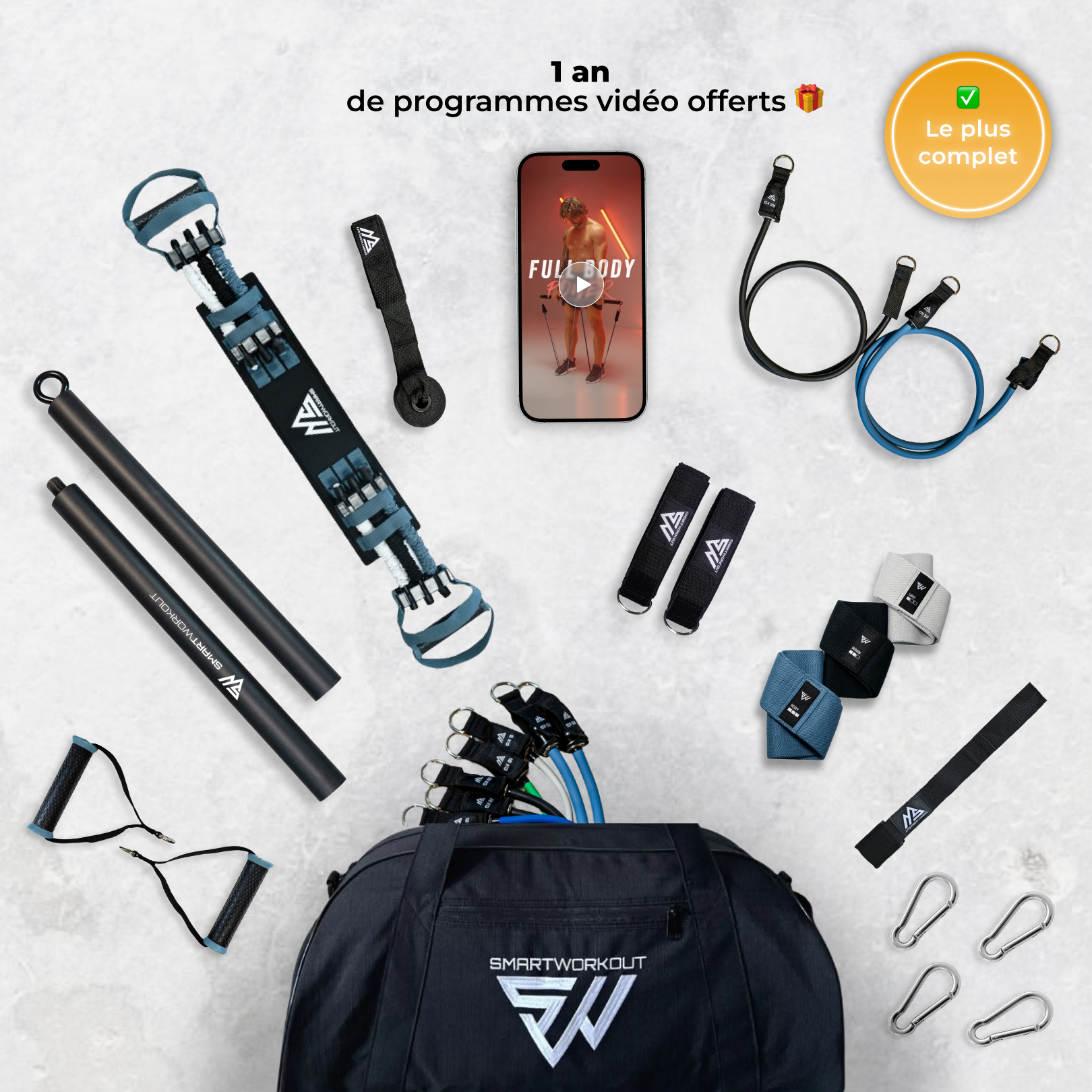 SmartWorkout Élite se transporte facilement dans un sac de sport donc la longueur fait plus de 53 cm – par exemple notre sac SmartWorkout. Le kit rentre dans une valise cabine, toutefois la barre n’est pas autorisée en bagage cabine car elle est considérée comme dangereuse.