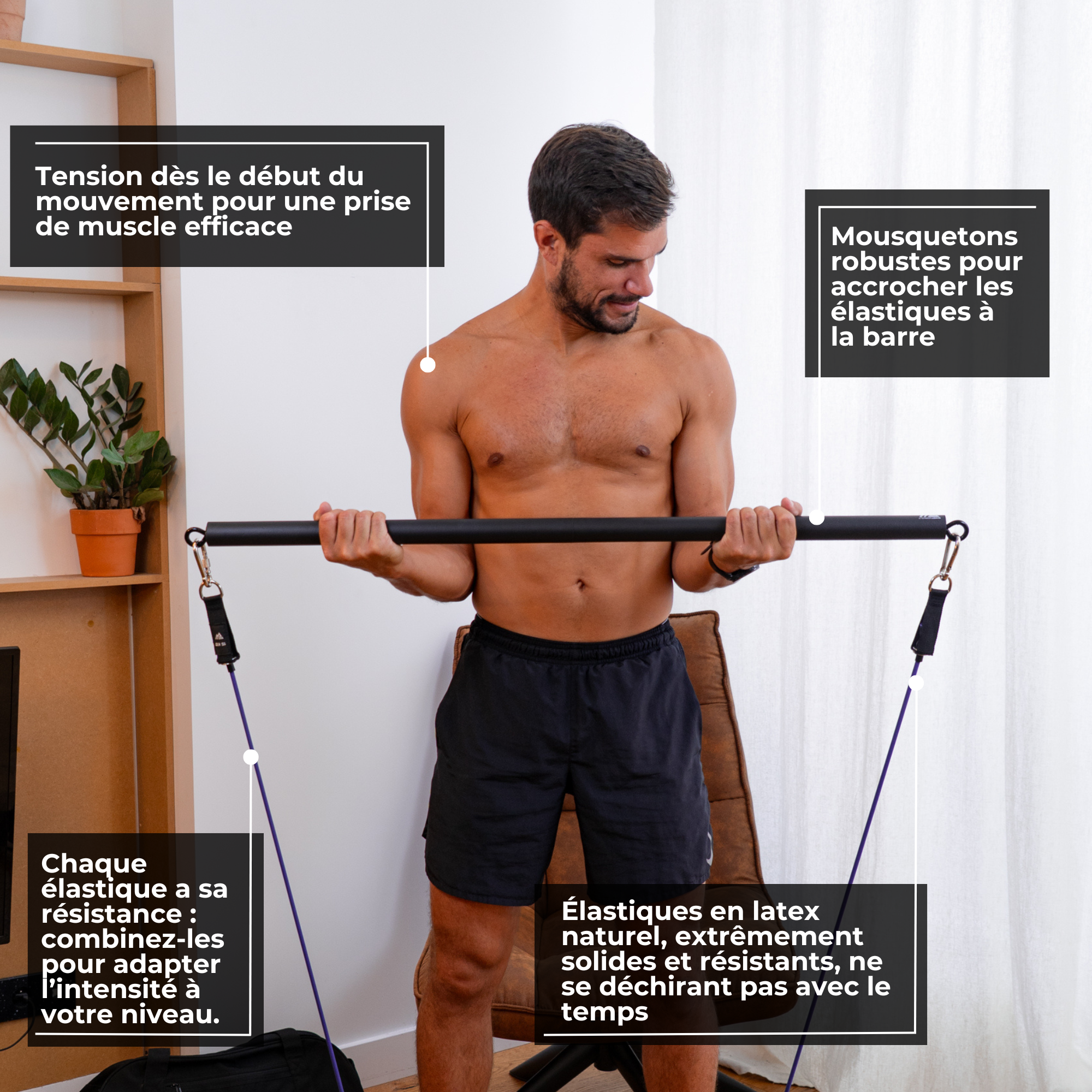Cependant, il est important de choisir des élastiques adaptés à votre niveau et de continuer à augmenter l’intensité de vos entraînements. Notre barre à élastique supporte jusqu’à 200 kg de résistance sur certains exercices, de quoi répondre à ce besoin ! -