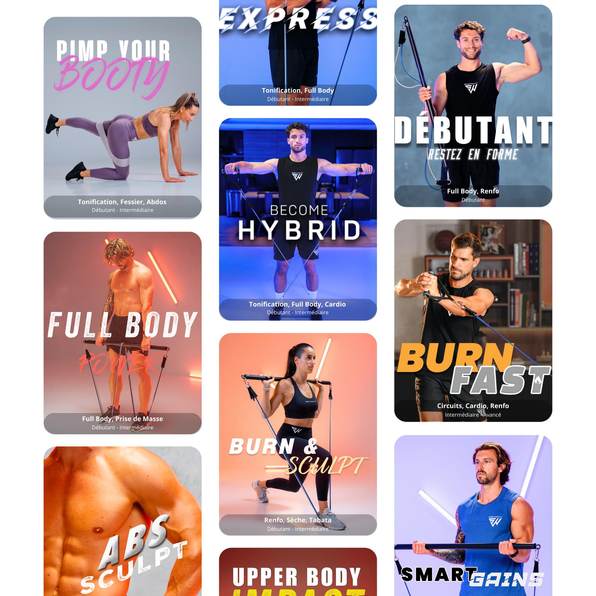L’application SmartWorkout propose 12 programmes de musculation conçus spécialement pour s’entraîner avec les équipements SmartWorkout et les élastiques de musculation. Que ce soit chez vous, en déplacement, ou en extérieur, boostez vos performances et optimisez vos résultats en suivant nos programmes : hypertrophie, séances express, renforcement musculaire, tonification et perte de poids.